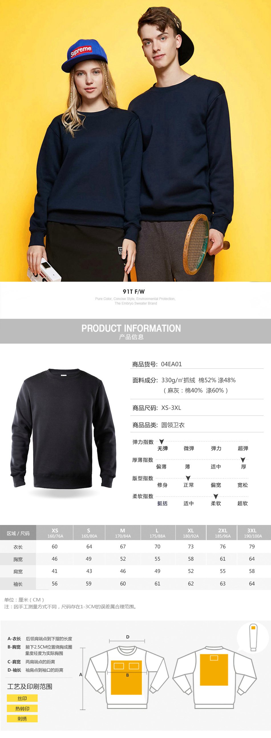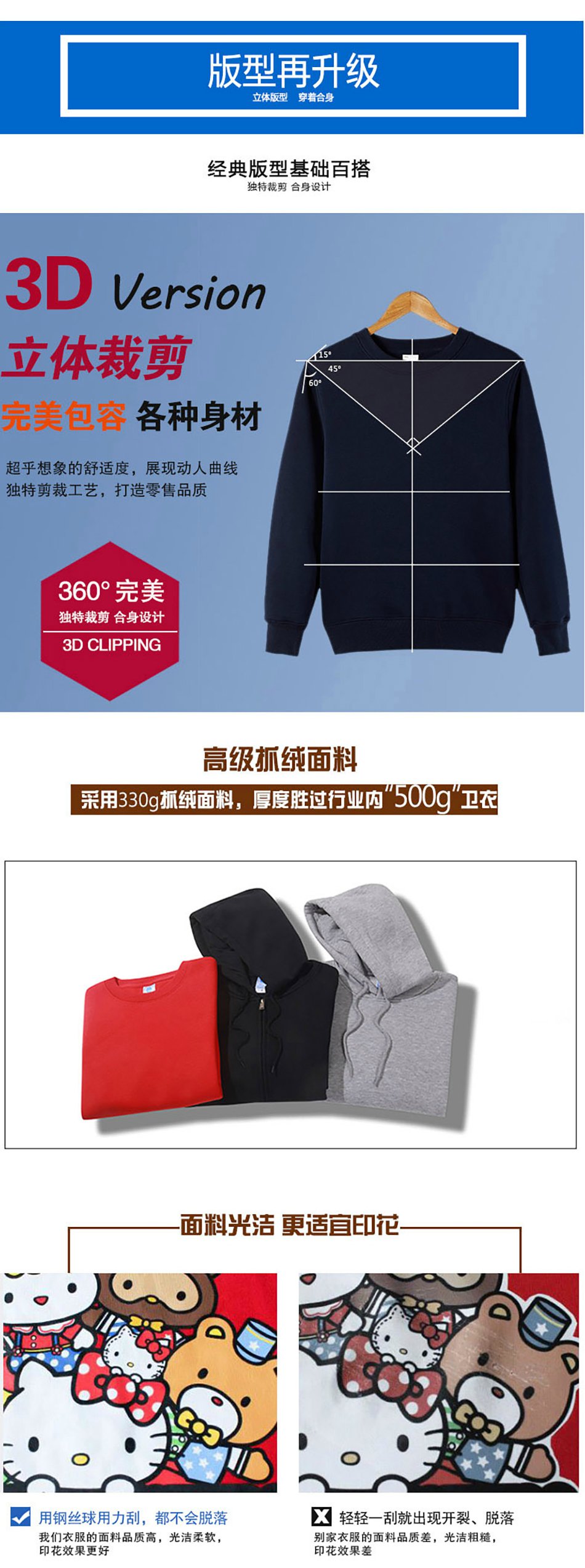 面料成份:330g/m²抓绒 棉52% 洗涤48%(麻灰:棉40% 涤60%)